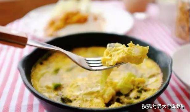3.關火,熱鍋不放油,立即倒入蔬菜。當蔬菜變軟多汁時,倒入預先打好的蛋液,用小火煮。