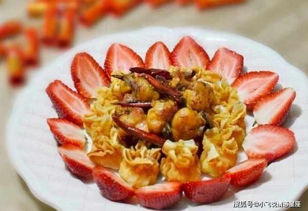 12.準備幹辣椒。13.鍋裡放油燒熱,放入幹辣椒和炸好的雞塊,加少許生抽稍微炒一下,盛入裝草莓的盤子裡。