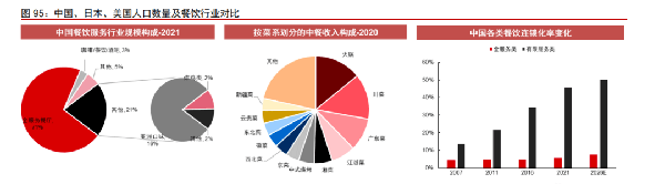 相比於日本和美國,中國人口數量優勢、餐飲行業發展潛力為餐飲供應鏈規模提供充分想象空間,2021 年中國人口數量分別為美國/日本的4.3/11.2倍,但人均餐飲支出僅為美國/日本的31%/44%。而預制菜作為餐飲供應鏈中未來的重要產品形態,在產品品類、單品規模上均具備較好想象空間。