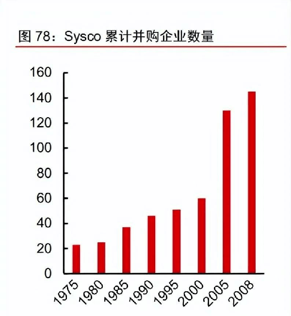1969 年,Sysco由9傢食品配送商合並成立,並在第二年實現上市。此後,公司不斷通過並購迅速進入新市場,再通過標準化改良和管理系統輸出,拓寬產品范圍、提升盈利能力,做大規模,80年代末已成為美國第一大食品分銷商。