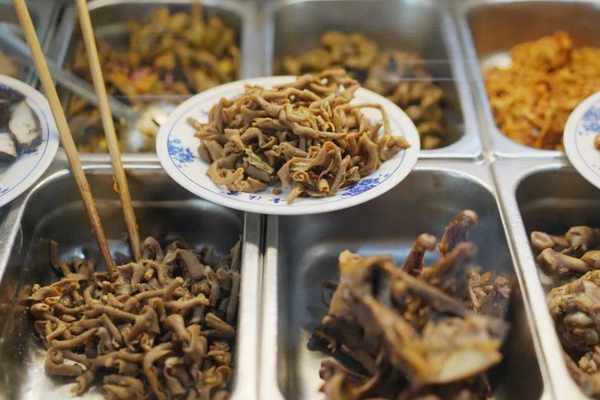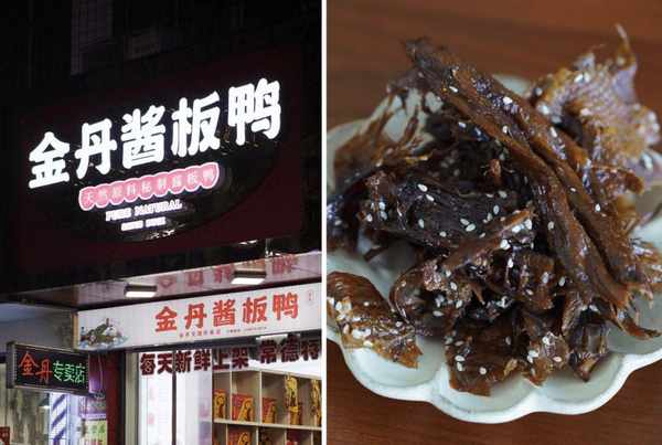 常德小吃多,其中大街小巷最多見的莫過於醬板鴨和鴨霸王。走進店裡才能搞明白:整隻的叫醬板鴨,按鴨頭、鴨脖、鴨翅、鴨腸等部位分開售賣的就叫鴨霸王。
