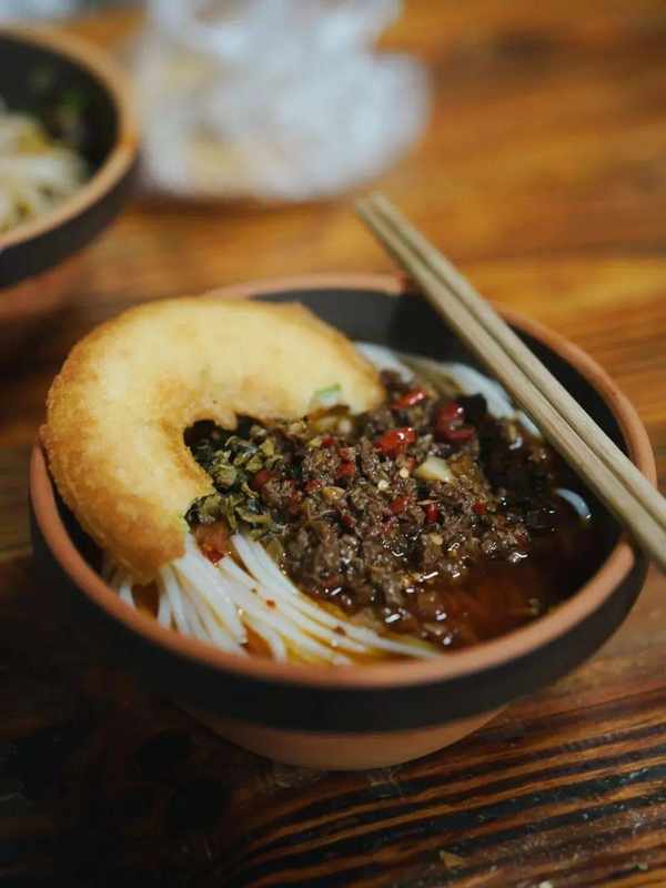 最受歡迎的碼子有三種:原湯牛肉、幹醃牛肉、酸辣牛肉,根據喜好可選湯粉或拌粉。湖南人稱吃粉的動作為“嗦”,其實很形象,米粉連帶著湯汁被吸入口中,香、彈、滑同時都被品嘗到。吃湯粉的時候,還要配一個“穿眼粑粑”才算地道。這種用米漿、黃豆漿與小蔥混合炸制的小吃,單吃酥脆,泡入米粉湯中,吸瞭湯汁與牛油變得酥軟。