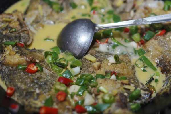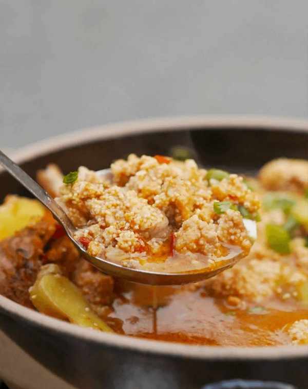 魚缽子吃到最後,一定要加點醡辣椒來糊,這是整道菜的精髓。醡辣椒是用糯米磨粉,拌上剁辣椒、封壇、發酵而成,加清水拌勻後,澆入魚湯底中形成糊,魚的鮮、醡辣椒的咸、香、辣,拌飯可謂一絕。