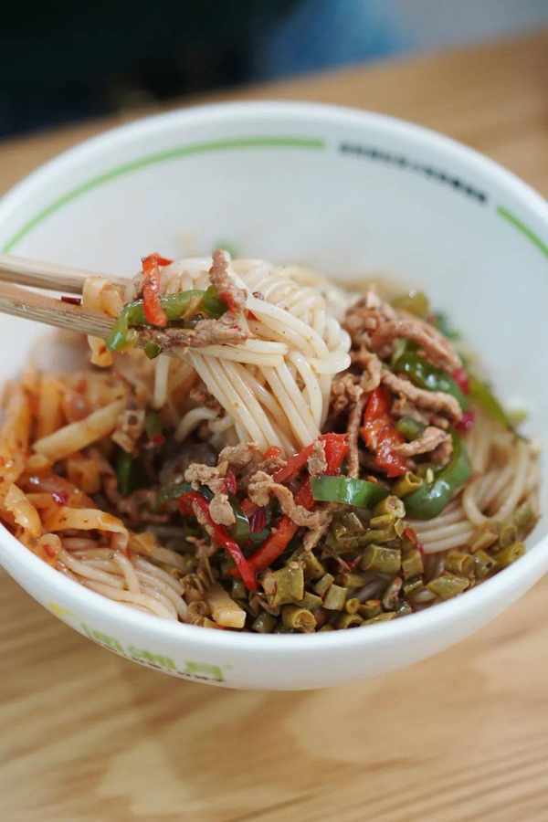 ▲ 紫蘇葉(左)香椿芽(右) 常德米粉的誕生,最早可追溯到清朝雍正年間,當時實行的“改土歸流”政策,新疆維吾爾族人的一支遷至今常德津市附近定居。回民原本愛吃面食,但當地不種植小麥,定居的回民便以米粉代替,創造瞭最早的牛肉粉。經年累月,常德本地食材逐漸被運用到米粉中,口味漸漸變重變辣,而種類也擴大到瞭湯粉、幹醃粉、燉粉等,炒碼更有紅燒牛肉、酸辣牛肉、牛雜羊雜以及多種多樣的各色小炒。