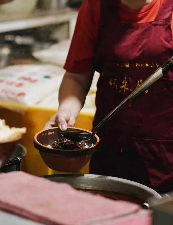 百紡農貿市場附近的米粉店“楊永勝”,是傢四十餘年老字號,做的就是傳統牛肉粉。湯底用牛骨,加上多種香辛料燉煮而成,站在門口遠遠就能聞見牛油混著紅油的濃香。楊永勝的每碗米粉都用土陶碗,即常德人稱“缽子”來裝。缽子保溫性好,米粉表面不易凝結成膜而過於油膩。