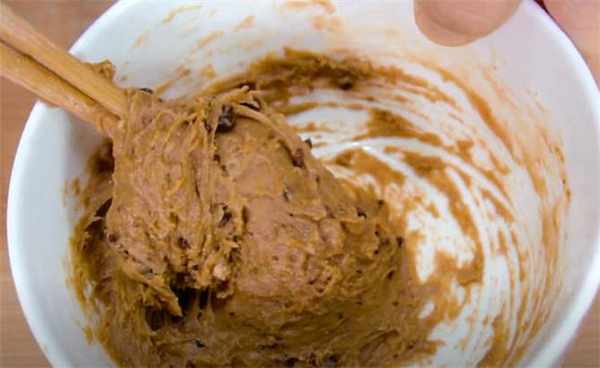 2.再準備40g的面粉,倒入20g的紅糖,10g的玉米油,16g的清水,攪一攪,一直攪成一個粘稠的面團備用。