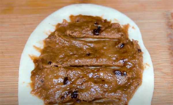 6.咱們剛才和好的這個紅糖面團揪取一點,然後鋪在這個上面,鋪好之後劃三刀,這樣一個紅糖油餅的胚子就做好瞭。