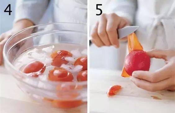 2、焯水後的西紅柿放到冰水中,西紅柿冷卻後把果皮撕下來。