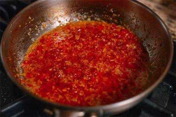 3、把3/4杯植物油加進去,放入200克辣椒片和糖,加2湯匙醬油,小火熬煮,待醬汁收幹,辣椒醬就做好瞭。