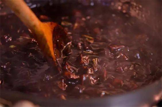 5、把半瓶紅酒加進去,煮到紅酒剩下2/3的時候,把搗碎的西紅柿放進去,中火煮15分鐘。