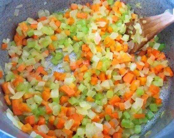 4、胡蘿卜、芹菜和洋蔥切丁,鍋裡加植物油燒熱,加蒜爆香,把蔬菜放進去,小火煸炒,加鹽、白糖,炒大概5分鐘。