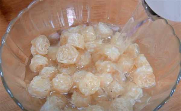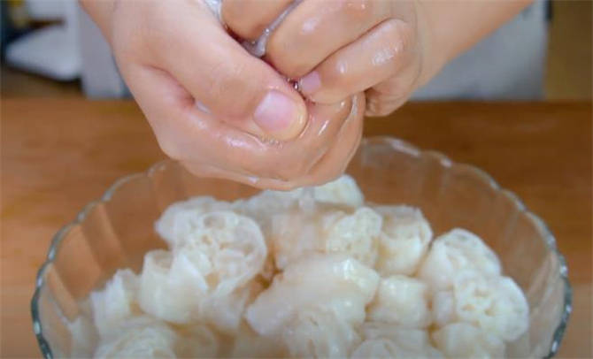 2.現在咱們這個面藕已經泡好瞭,它的體積已經膨脹起來瞭,我們把這個多餘的水分捏出去。