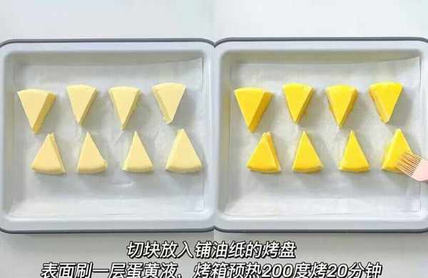 第三步:取出來切塊放入鋪油紙的烤盤,食材表面刷一層蛋黃液,烤箱預熱200度烤20分。