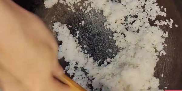 這時候千萬不要把大米放在鍋裡放涼。因為鍋裡有餘溫,那樣大米就容易變糊瞭。倒入盤中以後,我們用筷子把大米均勻的攤開。這樣大米就會涼的更快一些。接下來我們準備一個幹凈無油無水的大碗。