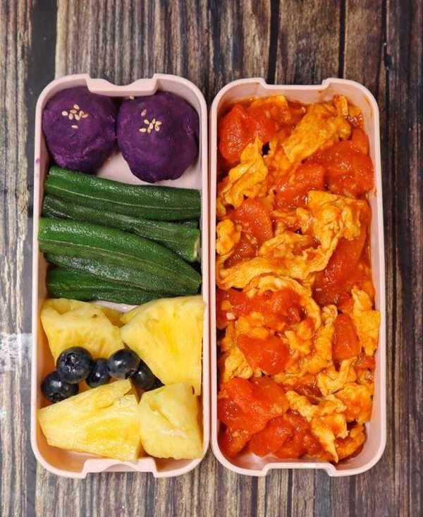 材料:西紅柿炒雞蛋+(菠蘿+藍莓+秋葵+紫薯)