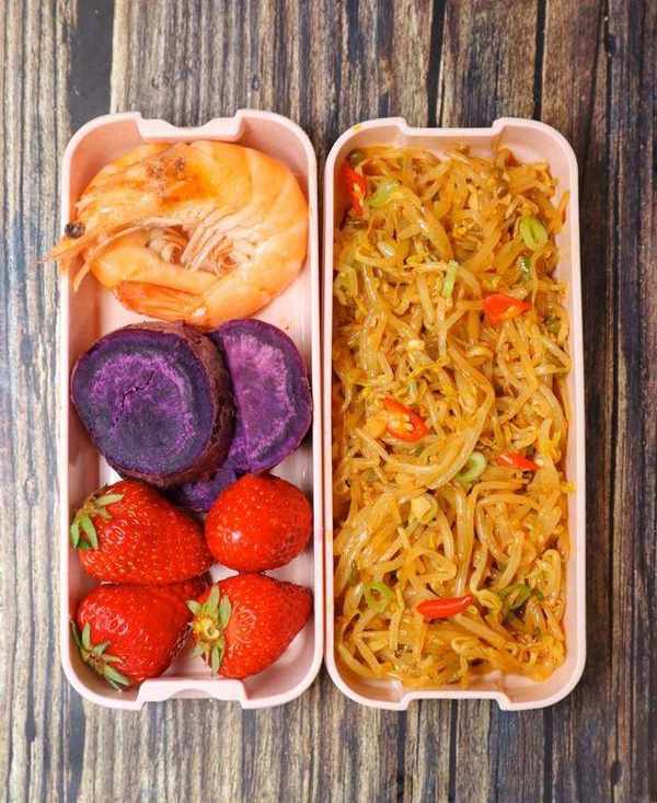 材料:涼拌豆芽+(蝦+紫薯+草莓)