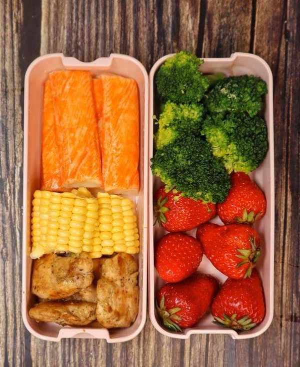 材料:煎雞胸+(玉米+蟹柳+草莓+西蘭花)