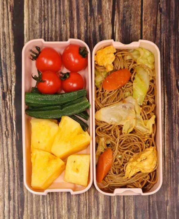 材料:圓白菜炒蕎麥面+(菠蘿+秋葵+小番茄)