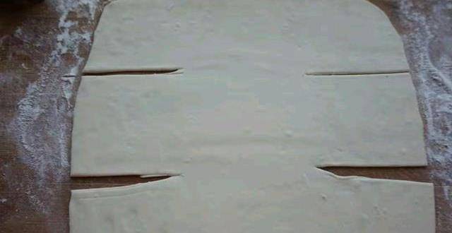 3.面團一分為二,分別揉圓,案板上撒幹面粉,將醒好面搟成方形的大面片,在面片上切上4刀。