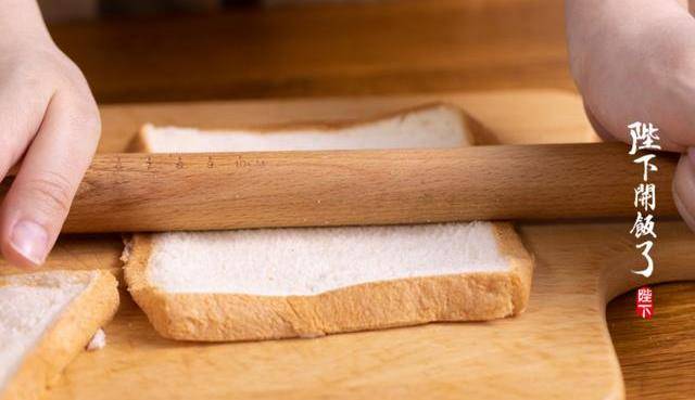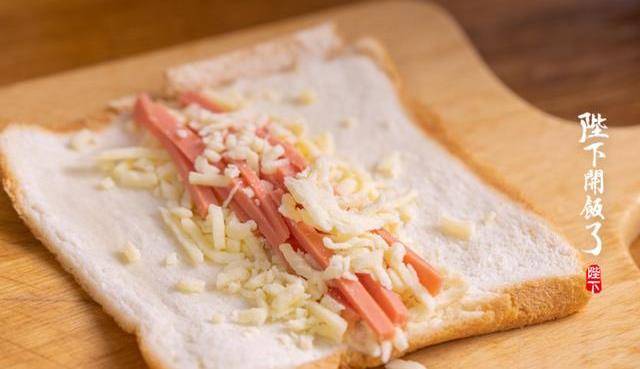 吐司搟平,加入芝士、火腿卷起,用兩根牙簽固定好。