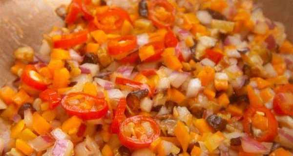 2.所有材料切小切好,芝士碎拿出解凍,起鍋燒油,放入香菇辣椒爆香,再加入洋蔥,胡蘿卜翻炒均勻,加入適量的鹽翻炒均勻
