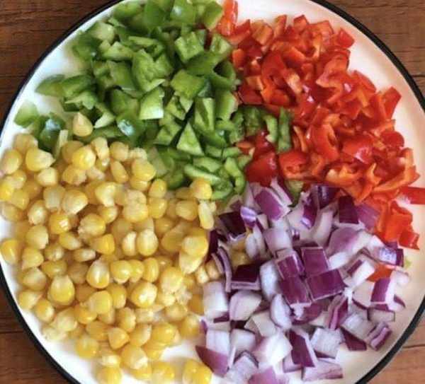 第二步:青紅椒洗凈切均勻小塊備用,洋蔥去掉表面那層皮,切均勻小塊狀,火腿腸切均勻小丁狀,玉米先放入鍋中煮熟,然後瓣成一個粒兒一個粒兒的