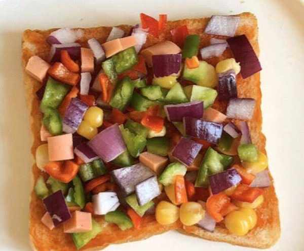 第三步:將要準備吃的吐司數量都在其中一面塗上蕃茄醬,然後將切好的,青紅椒丁,洋蔥丁,玉米粒都混合均勻鋪在上面