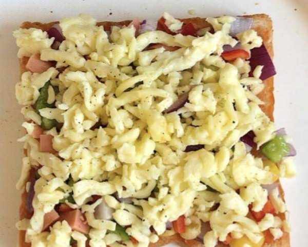 第四步:再在放好的蔬菜上面均勻撒上一層黑胡椒粉,最後放上一層芝士碎,所有的吐司都這樣做好