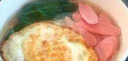 第三步:,下入青菜、火腿腸,煮一分鐘,接下來調個碗汁,碗中加入小蔥、香醋,香油,生抽,把煮好的面條、火腿腸、青菜盛入料碗中,再加上孩子愛吃的荷包蛋,一道營養又養胃的早餐面就做好瞭,