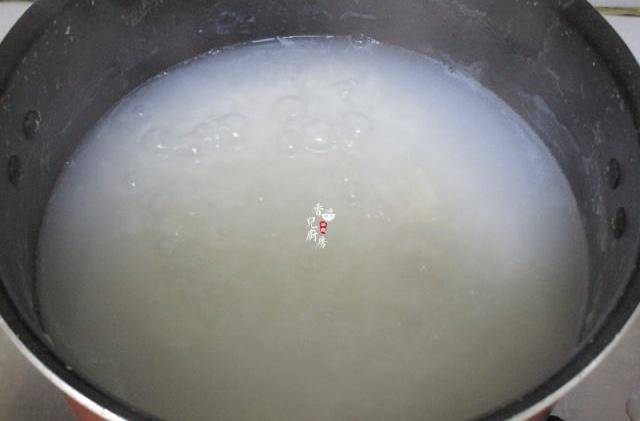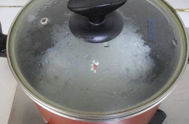 2.先把冷大米飯倒入鍋中,加入清水後加蓋大火燒開後轉小火煮。