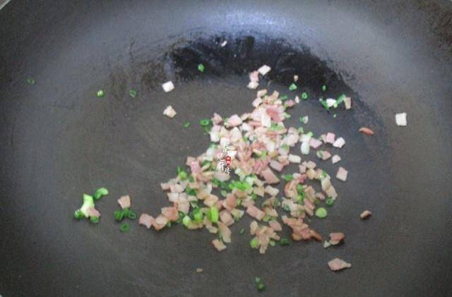 7.這個時候把炒鍋加熱後先把培根炒出香味後再把蔥花入鍋爆出香味後熄火出鍋。