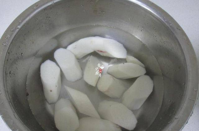 3.煮粥的時候把山藥處理好,山藥去皮後洗凈切成塊後泡入清水裡以免氧化變黑。