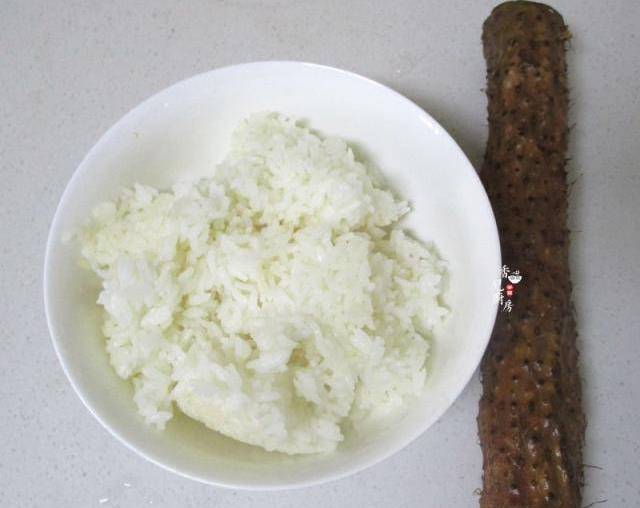 步驟;1.這是用來煮粥的食材,我用的是冷大米飯,山藥我用的是麻山藥,口感和鐵棍山藥很相似,就是煮的時間要久一些,先把山藥外表洗凈。