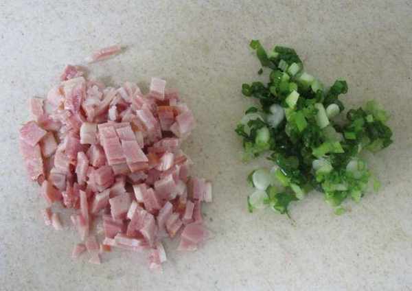 5.把培根切成小塊,小蔥洗凈後切成蔥花狀待用。