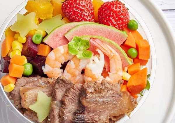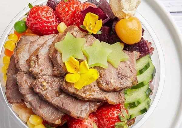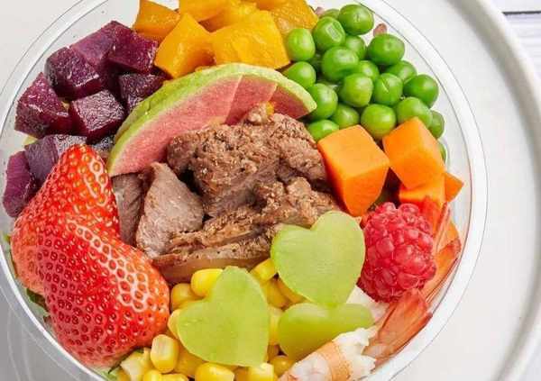 制作方法2、紫薯+紅薯+黃瓜+胡蘿卜+青豆+玉米+草莓+牛肉+菇娘+三色堇