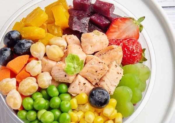 制作方法8、紫薯+紅薯+胡蘿卜+青豆+玉米+草莓+藍莓+鷹嘴豆+萵筍+三文魚