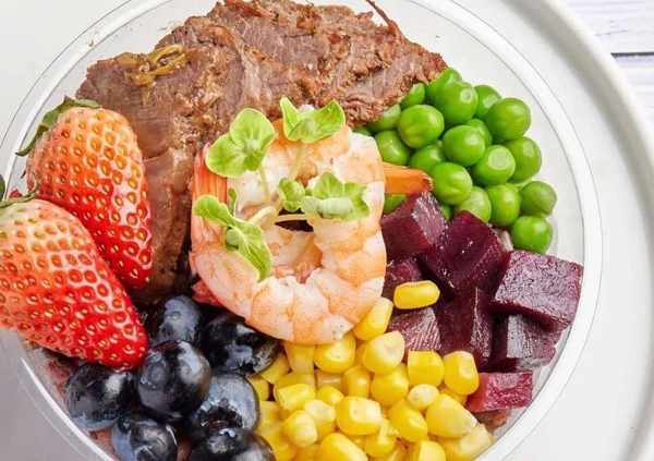 制作方法6、紫薯+青豆+玉米+草莓+藍莓+牛肉+蝦仁