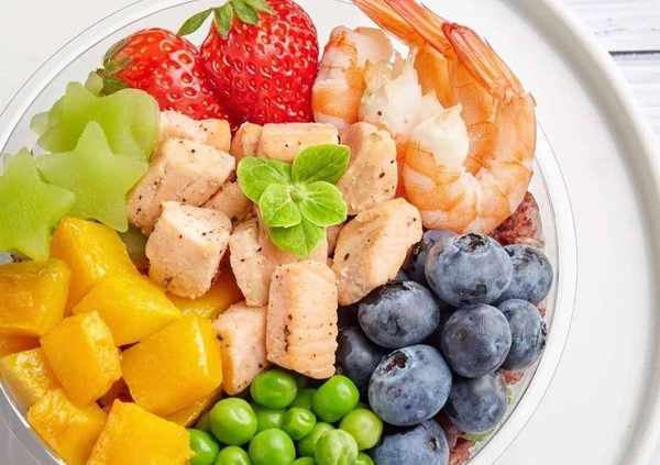 制作方法5、紅豆+青豆+草莓+萵筍+藍莓+蝦仁+三文魚