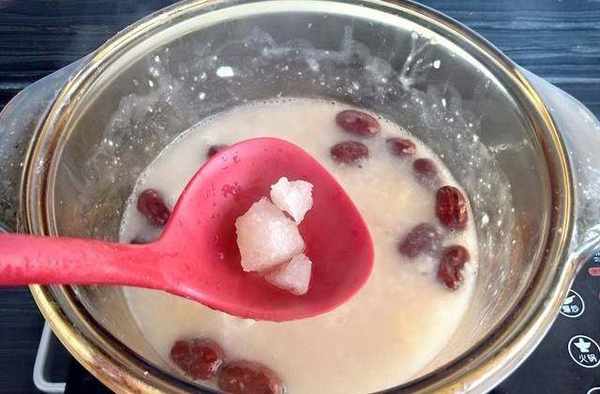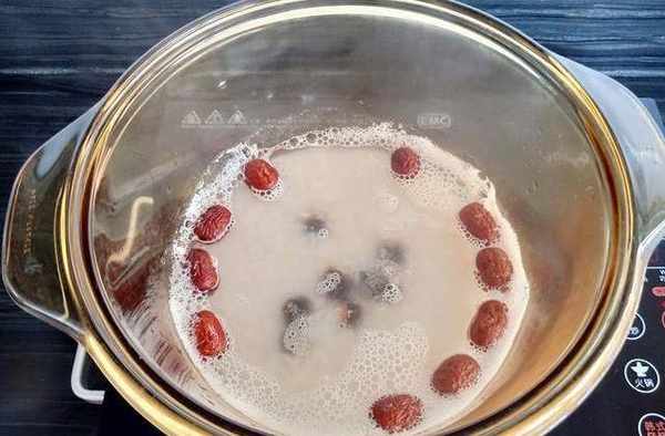 4,同時放入紅棗桂圓。煮沸,中火煲30分鐘以上要多攪動;