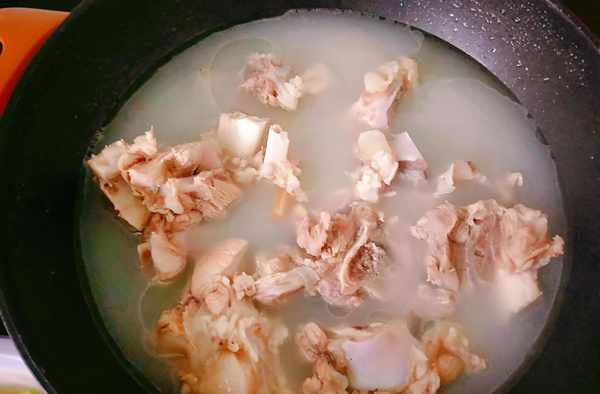 3,豬大骨冷水下鍋,水量沒過大骨,加入適量的料酒和薑片,大火燒開後,翻一下,待大骨發白,撈入盆中,涼水洗去浮沫。