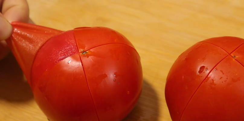 1、 西紅柿清洗幹凈後,切十字花刀,淋開水,剝去外皮,切成小塊。