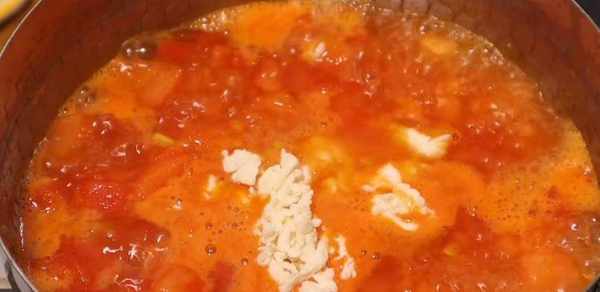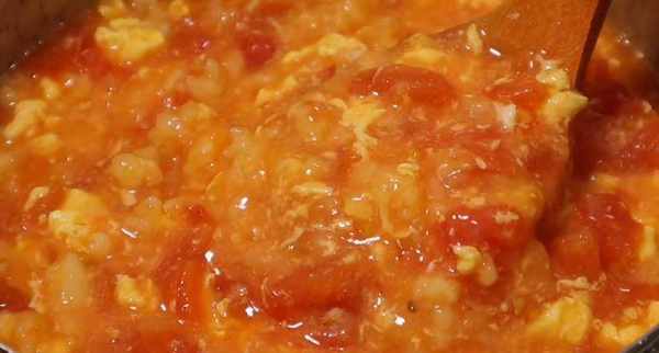 4、 熱鍋冷油,放入蔥花和西紅柿,炒成糊狀後,加兩小碗清水,兩勺番茄醬,半勺糖和適量的鹽,煮沸後倒入面疙瘩快速攪拌,再倒入雞蛋液,煮2分鐘,煮時一定要多攪拌,避免糊鍋。