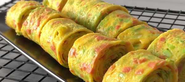 4.準備一個平底不沾鍋或電餅鐺開大火預熱兩分鍋鐘,倒入雞液,快速將料鋪平,轉小火煎至定型,翻面繼續煎一分鐘,卷成卷,取出後切成小塊就可以吃瞭。