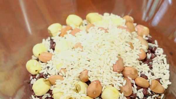 1.取等比例的黑糯米、白糯米、紅豆、蓮子花生用清水洗凈,放入大碗中加水沒過,浸泡一夜。