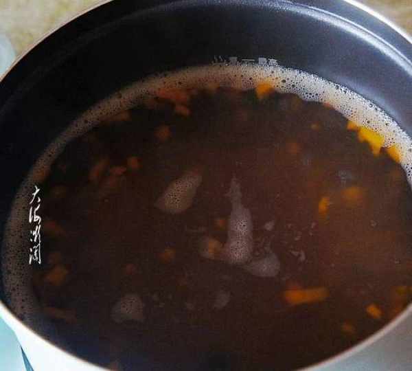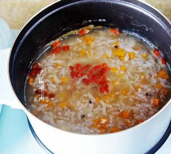 第4步、大約煮瞭半小時,食材不同熟的時間也有差別。很黏稠,加入洗幹凈的枸杞子,再煮一分鐘關火。