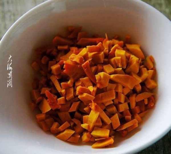 第2步、南瓜去皮去瓤,洗凈切丁。