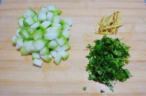 6、同時冬瓜去皮,切成一厘米大小的小丁,薑切絲,香菜切好備用。