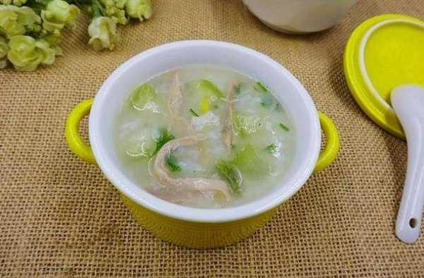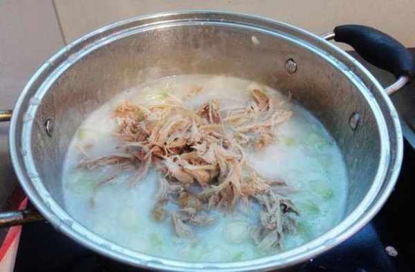 10、待冬瓜煮熟,粥濃稠時,放入鴨肉絲拌勻。