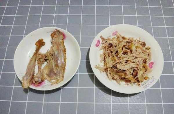 4、在燒水煮粥的時候,我們把鹵鴨腿肉用手撕下來,撕成肉絲備用。