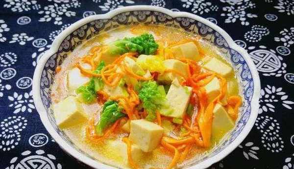 1、蟲草花浸泡,西蘭花洗凈切小,豆腐也切小